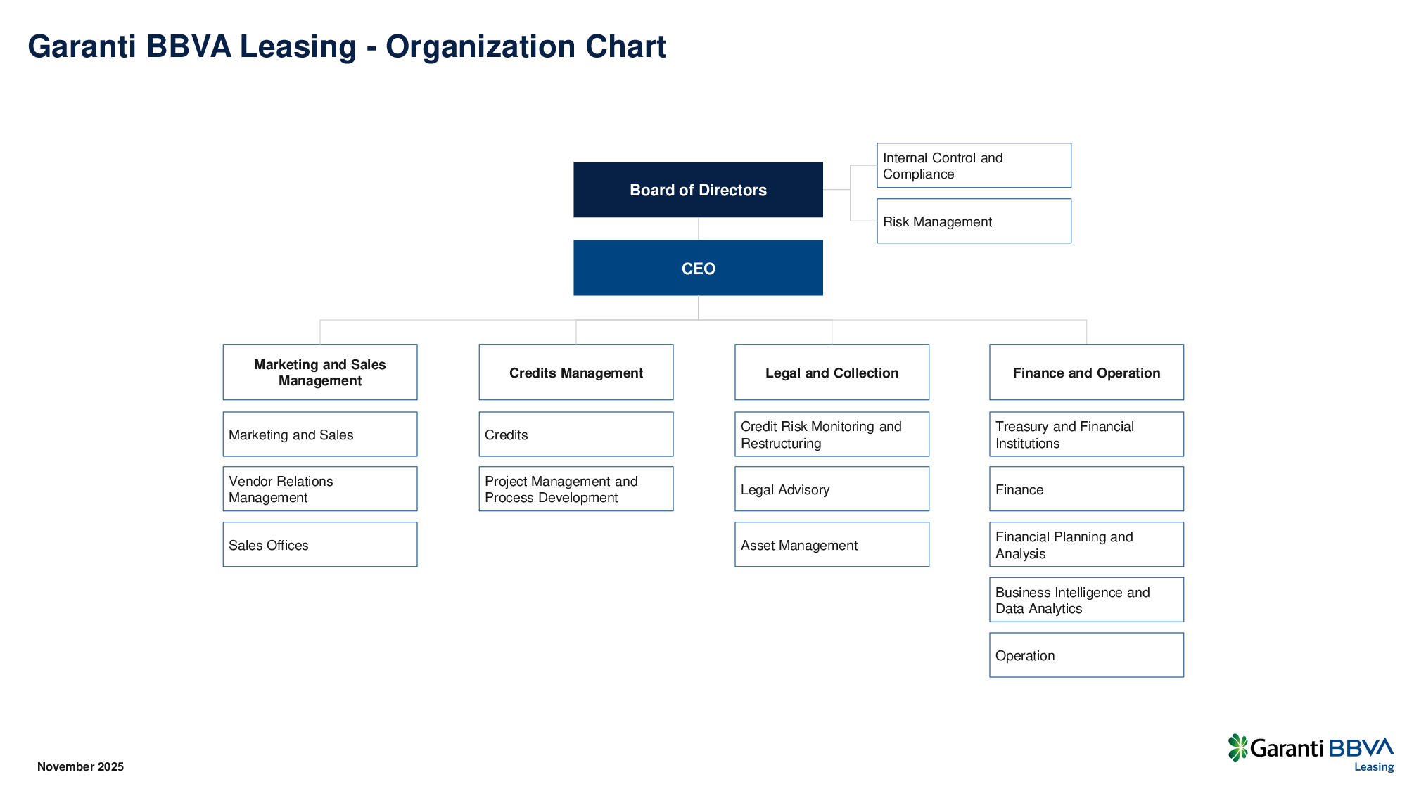 Garanti Finansal Kiralama A.Ş. was established on October 9, 1990 as a leasing company to serve customers in Turkey and abroad. Since its inception, the company has been carrying out the leasing operations of corporate, commercial, small- and medium-sized enterprises, addressing the needs of an extensive customer base. Aiming to provide its customers with up-to-date services and products, Garanti BBVA Leasing prioritizes customer satisfaction and offers them an all-round support. With internationally recognized and qualified human resources, strong technical infrastructure, effective customer and vendor relations and an approximately 30 years of experience, Garanti BBVA Leasing steers the sector.